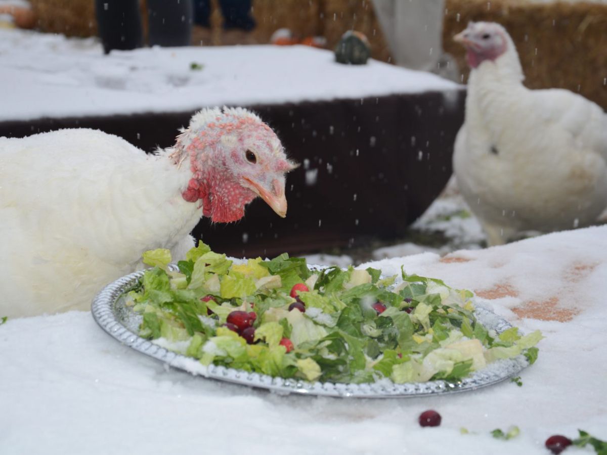 • Celebrating together as our turkeys indulge in a delicious feast of pumpkin pie, squash, cranberries, and kale salad during our annual Feeding of the Turkeys Ceremony