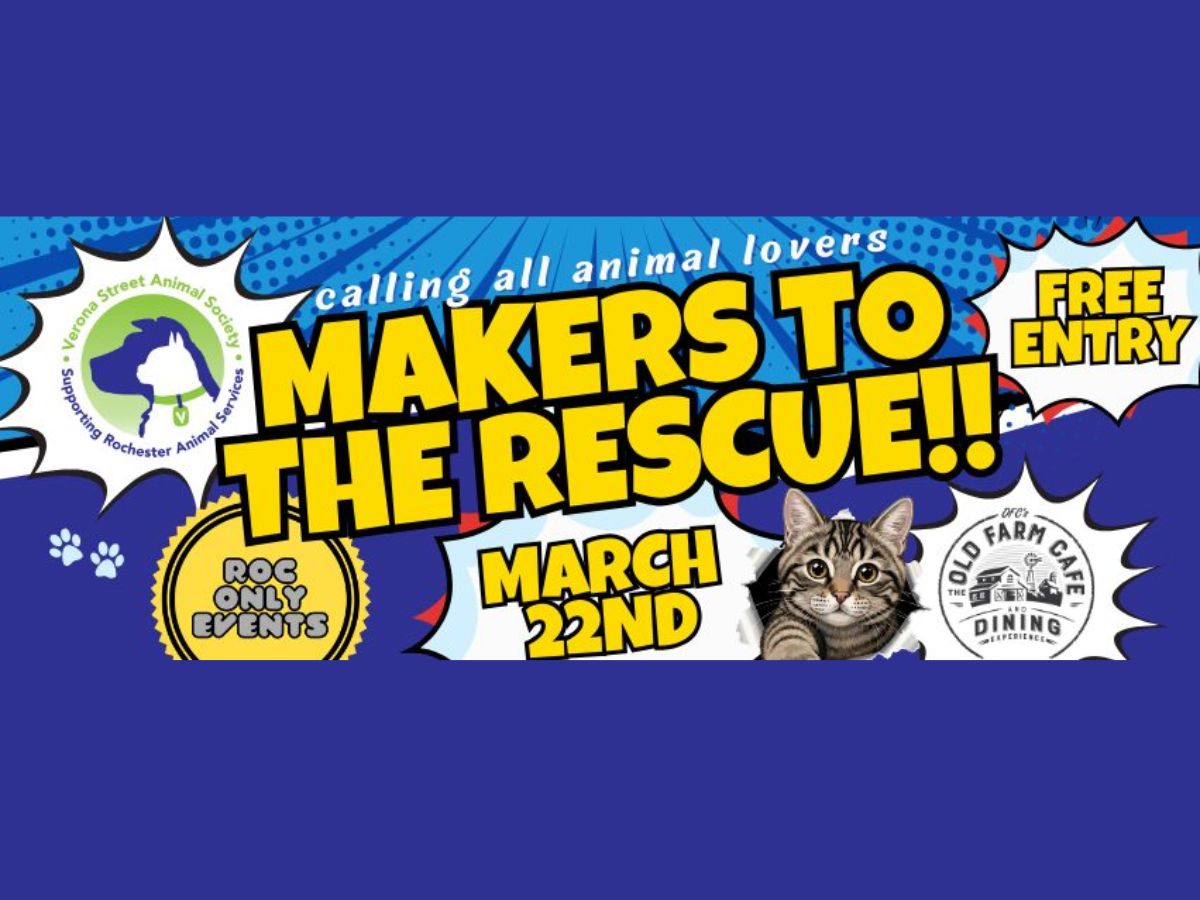 Makers to the Rescue is a one-day community market and fundraiser bringing together local artisans, animal lovers, and good food—all in support of Verona Street Animal Society - VSAS is a not-for-profit organization dedicated to supporting Rochester Animal Services in helping pets and their owners in our community. Their mission includes keeping pets safe, strengthening the human-animal bond, and saving lives—through programs that help both shelter animals and those in foster care.